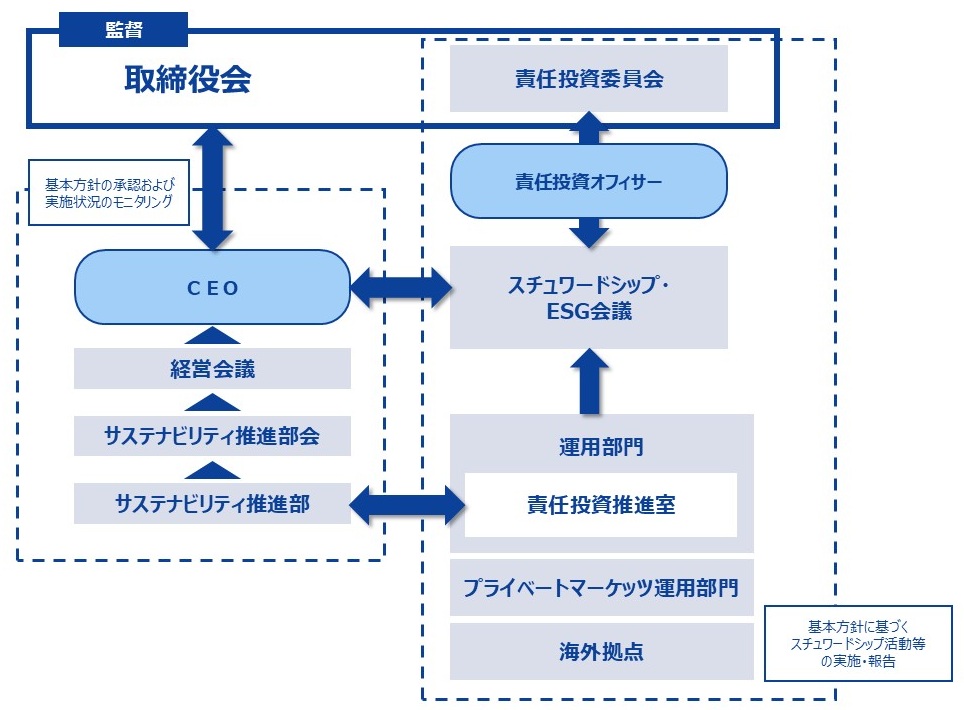 サステナブル投資に関する方針策定および実施状況のモニタリングは、「スチュワードシップ・ESG会議」、「経営会議」および「取締役会(内部委員会である責任投資委員会を含む)」により行っております。