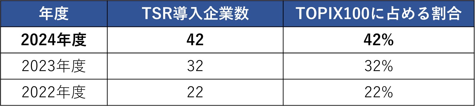 今回TOPIX100構成企業の中でTSRを導入している企業の要点を取りまとめると以下の表になります。