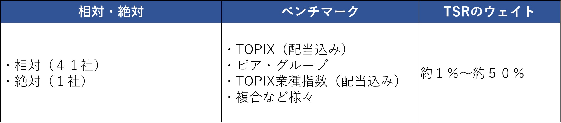 相対値か絶対値かではほとんどの企業が相対値を選択しています。また、ベンチマークはTOPIX(配当込み)とピア・グループを採用している企業が多く、その他にも様々なものをベンチマークとしている企業があり、非常に多岐にわたり複雑な構造となっていました。