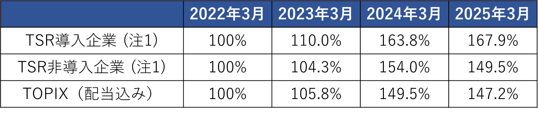 - TSR導入企業は2023年3月から2025年3月までの3年間で67.9%のリターンを示しました。