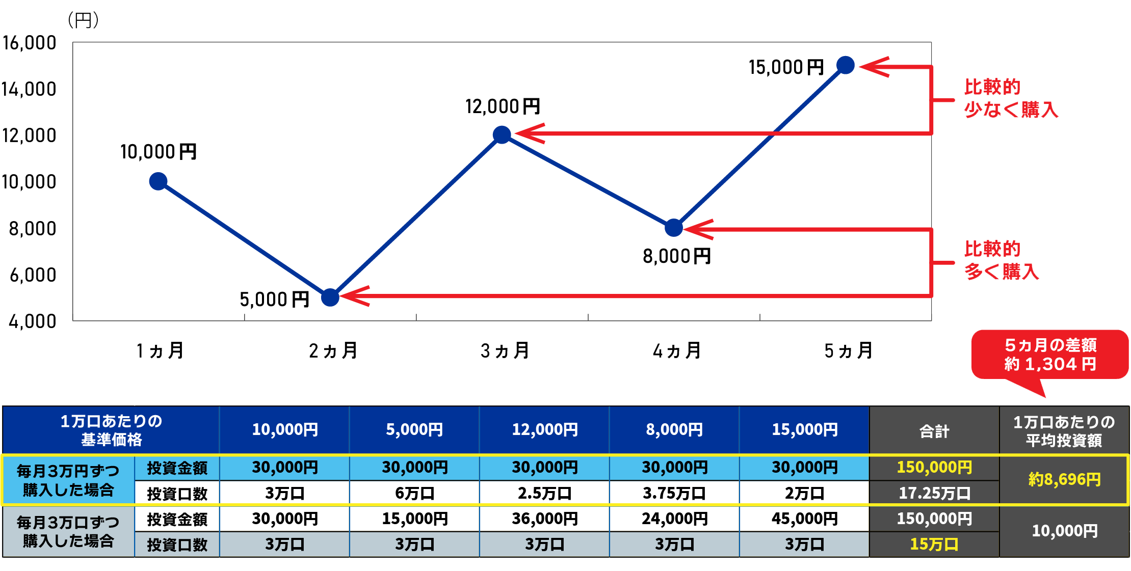(注)毎⽉末に1万円ずつ投資したと仮定した場合のシミュレーション。ただし、最終⽉は投資しません。