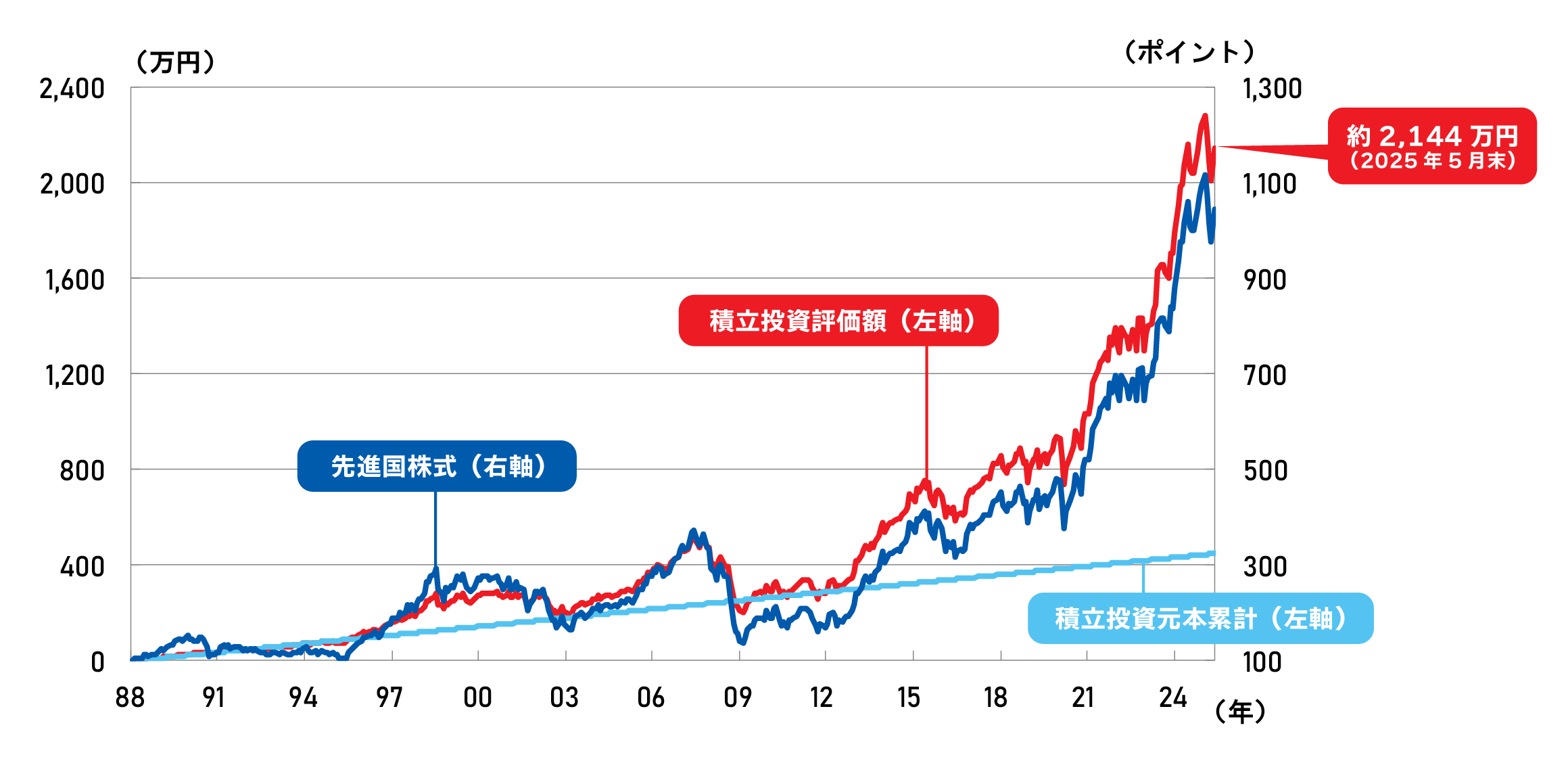 (MSCIワールドを毎月1万円、円ベース。累計金額448万円[2025年5月末現在])