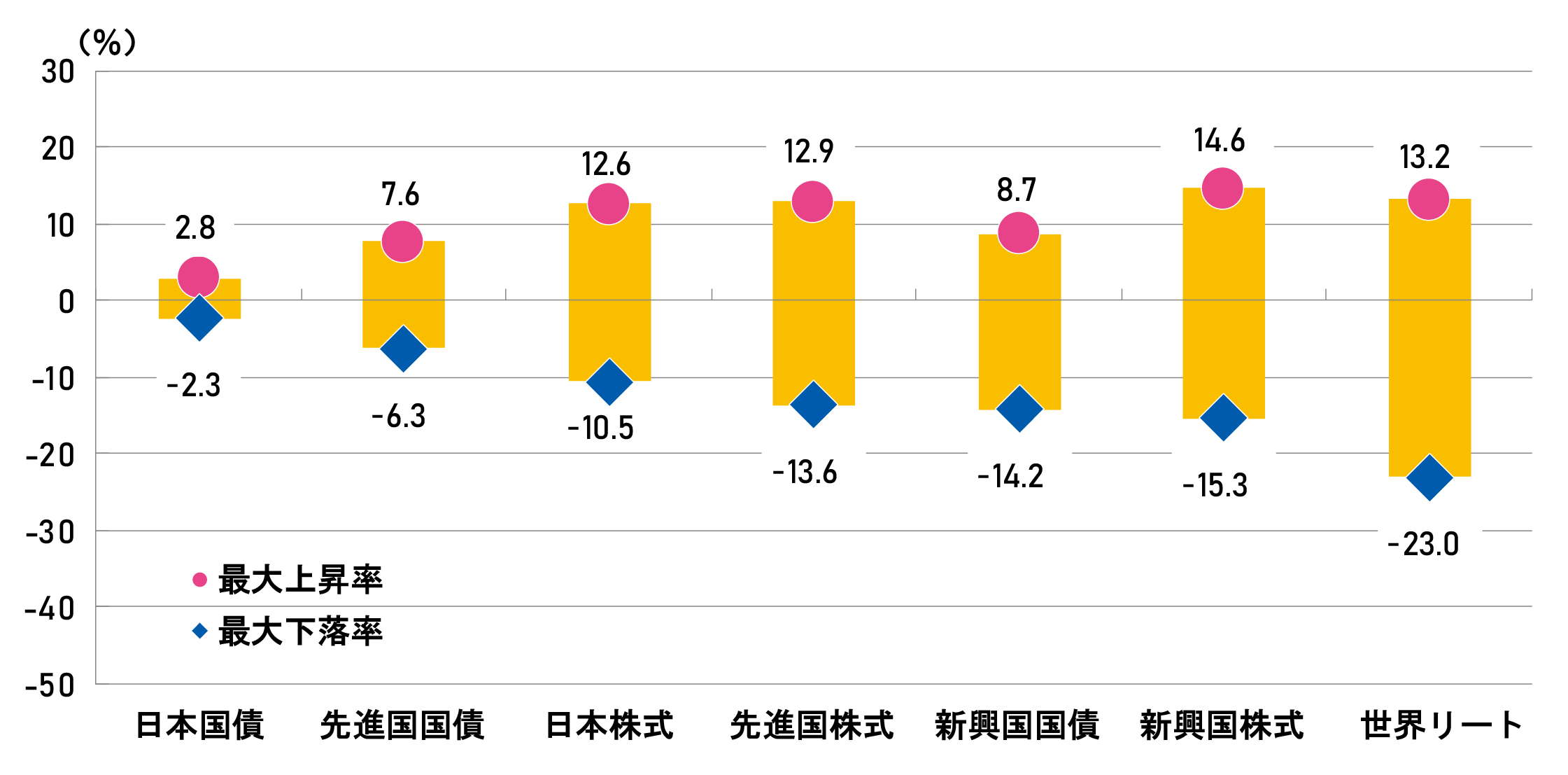 リターンのばらつきは、投資対象資産の最大上昇率・最大下落率でも表すことができます。