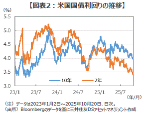 ■こうした環境下で、米国国債利回りは低下基調をたどっています(図表2)。もっとも、2026年に向けては、今年7月に成立した大型の減税・歳出法(OBBBA)など、拡張的な財政政策を背景に景気が持ち直す可能性があり、長期金利(10年)を中心に上昇圧力が徐々に強まる展開も想定されます。