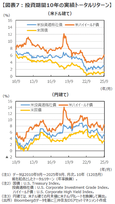 ■米国の投資適格社債、ハイイールド債、国債(米ドル建て)に10年間投資した場合の実績トータルリターン(図表7)を見ると、2025年9月まで10年間では、投資適格社債が年率+3.1%、ハイイールド債が同+6.2%となり、国債(同+1.2%)を上回っています。