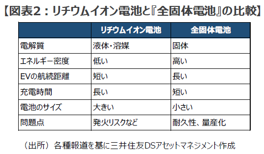 ■EVの普及については地域間でばらつきがありますが、世界の2大市場の一つである米国では、長距離移動の手段としての自動車の重要性から、電池の性能が市場拡大の妨げとなってきました。仮に『全固体電池』が実用化し、普及していくと、現在は中国や欧州に比べて出遅れている米国におけるEVの販売シェアは、急速にキャッチアップする可能性があります。