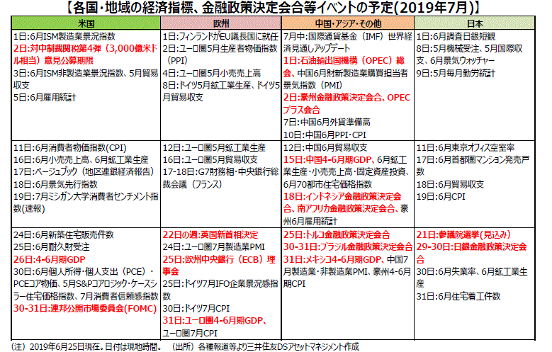 ■米国では、月末に連邦公開市場委員会(FOMC)が行われます。6月のFOMCでは次の一手が利下げとなることが示唆されました。景気悪化を事前に防ぐ予防的な措置として、早ければ7月のFOMCで0.25%の利下げが実施されるとみられます。