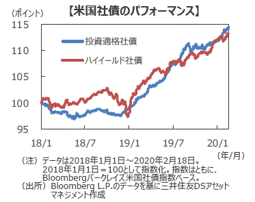 ■米国社債市場は、米中貿易協議の部分合意を受けたリスク志向の高まりや、金融緩和の長期化観測を背景に、底堅く推移しています。2月18日までの年初来騰落率を見ると、投資適格社債が+2.5%、ハイイールド社債は+1.2%となっています。