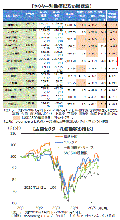 5月14日現在、「情報技術」は年初来の水準を回復しました。そのけん引役となったサブセクターは「ソフトウエア」、「コンピュータ周辺機器」、「半導体」などです。それぞれの代表的な銘柄が、マイクロソフト、アップル、エヌビディアなどです。マイクロソフトは新型コロナウイルスの感染拡大によるサプライチェーンの混乱もリモートワークの恩恵などで利益の悪化が相殺され、またクラウド需要の急拡大が恩恵をもたらしています。アップルはオンライン学習の需要が伸びるなど、これまでの多角化が業績のブレを押さえているようです。今後は中核のiPhoneをベースに、世界各国・地域のロックダウン解除で経済活動の回復が見通せるかどうかが重要です。