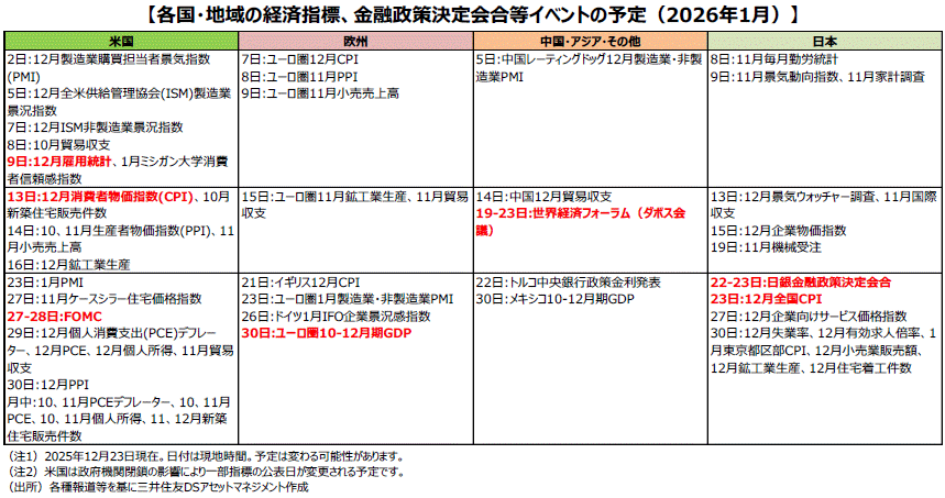 ■27、28日には、米連邦準備制度理事会(FRB)による米連邦公開市場委員会(FOMC)が開催されます。12月に公表されたFOMCメンバーによる経済見通しによると、先行きの利下げ回数の見通しはメンバー内でも見解が分かれていることが窺われます。今回のFOMCの声明文や記者会見で、2026年以降の利下げに対してどのような姿勢が示されるのかが注目されます。また、9日には12月の雇用統計が公表されます。12月半ばに公表された10、11月分の雇用統計は雇用情勢の大幅な減速を示すものではありませんでしたが、パウエルFRB議長は12月のFOMC後の記者会見において労働市場の下振れリスクにも言及しています。今後の金融政策を見通す上で、雇用統計などの経済指標も引き続き焦点になると見られます。