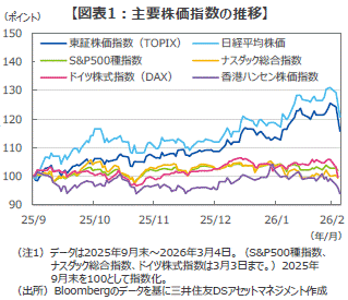 ■また、2月の解散総選挙で与党が圧勝したことを受け、高市政権の政策推進力が高まるとの期待から、日本株は主要国と比べて上昇率が大きかったことから、当面の利益を確定しようとする投資家の売りが膨らんだものとみられます(図表1)。