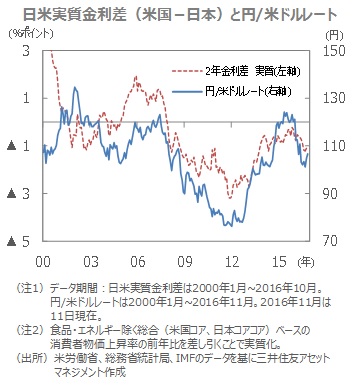 ■当面は12月の米金融政策が注目されます。米連邦準備制度理事会(FRB)は12月の米連邦公開市場委員会(FOMC)で利上げを決定する可能性が高いと予想されます。来年以降の利上げについても慎重な判断のもと2回程度の利上げが予想されています。一方、日本の金融政策には大きな変化はないと考えられ、マイナス圏にある実質金利差の縮小傾向は続く見通しです。米ドル高・円安へと向かいやすい環境と言えそうです。