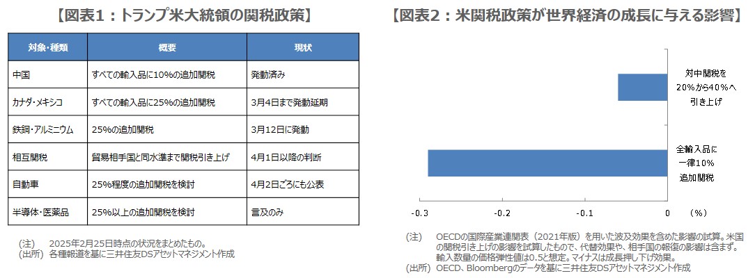 トランプ米大統領は2月1日に、カナダとメキシコおよび中国に対し追加関税を課す大統領令に署名して以降、積極的に関税政策を推進しています(図表1)。カナダとメキシコに対する追加関税の発動は3月4日まで延期されましたが、中国については2月4日からすべての輸入品に10%の追加関税が課されることとなりました。これを受け中国側は2月10日、米国の石炭や液化天然ガス(LNG)などに報復関税を発動しました。