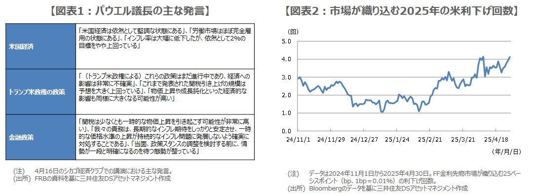次に、パウエル議長の記者会見では、トランプ米政権による関税引き上げなどの政策が経済に与える影響や、先行きの金融政策の運営について、どのような見解が示されるかに市場の注目が集まっています。なお、パウエル議長は4月16日の講演で、「これまで発表された関税引き上げの規模は予想を大きく上回っている」、「物価上昇や成長鈍化といった経済的な影響も同様に大きくなる可能性が高い」と述べています(図表1)。