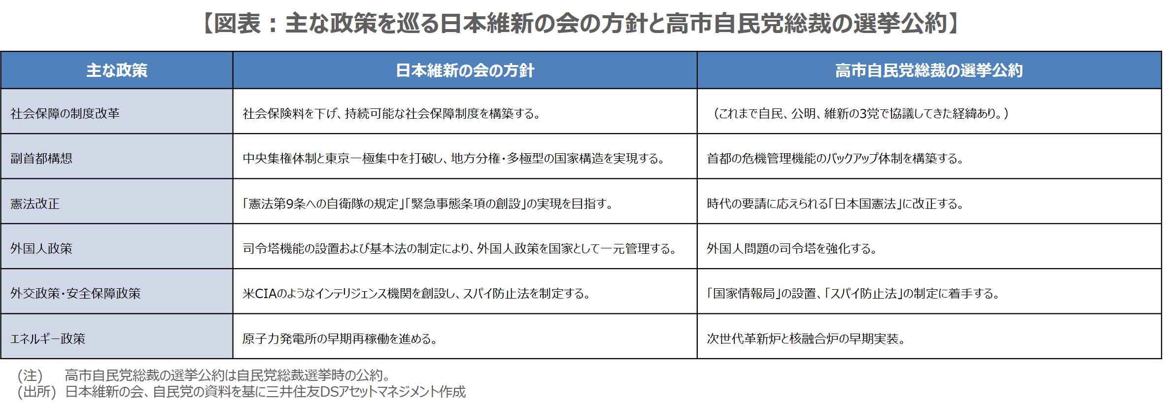 このほかにも、維新の政策方針と高市氏の公約を比較すると、憲法改正や外国人政策などのテーマで親和性が高いことが確認されます(図表)。仮に、自民と維新の連立政権が誕生した場合、衆議院(定員465議席)の議席数は2党合計で231議席となり、過半数の233議席に迫ることになります。また、参議院(定員248議席)の議席数は120議席となり、こちらも過半数の125議席に近づきます。