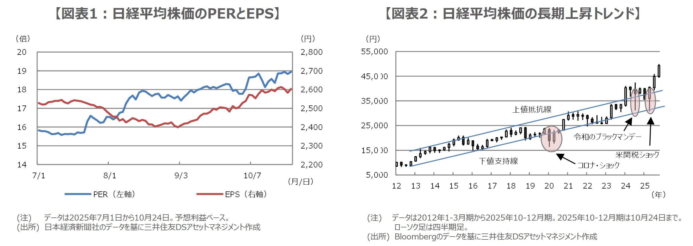 日経平均を長期の視点でみると、2012年以降、上昇トレンドを形成していることが分かります(図表2)。日経平均は2020年のコロナ・ショックで下値支持線を割り込んだものの、一時的なものにとどまり、2024年8月の急落(令和のブラックマンデー)では下値支持線を割り込むことはなく、2025年4月の米関税ショックでも下値支持線でしっかりサポートされました。