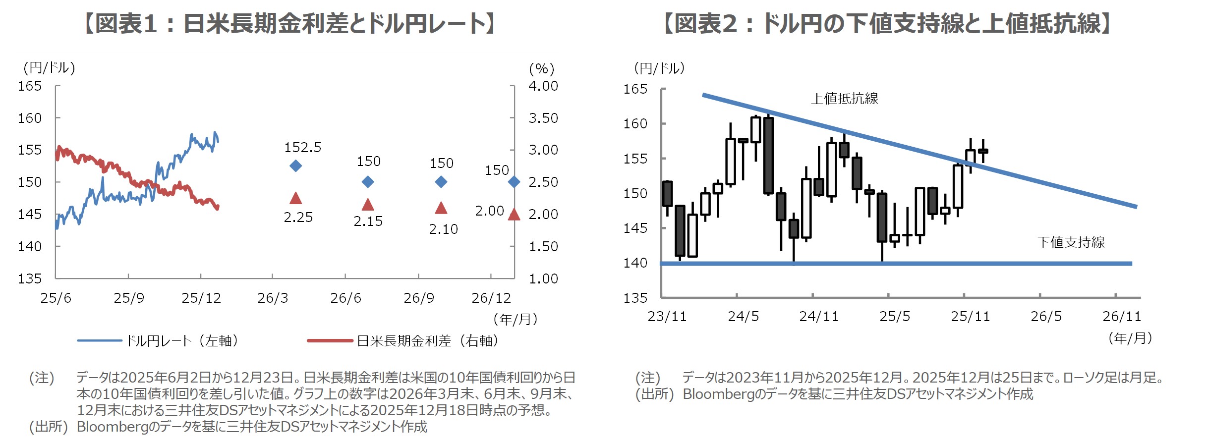 一般に、日米金利差の縮小は、ドル安・円高要因とされますが、現時点のドル円は、日米金利差を踏まえると、ドル高・円安方向に乖離しています(図表1)。背景には、高市政権の拡張的な財政政策と日銀の緩やかな利上げペースを材料とする、投機的な円売りが影響しているとも推測され、ドル円は短期的に1ドル=160円水準を意識しつつ、政府・日銀の為替介入の動きをにらんだ神経質な相場展開が見込まれます。