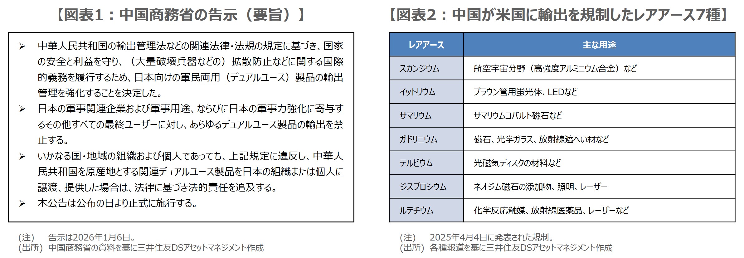 中国商務省は1月6日、輸出管理法などの規定に基づき、日本向けの軍民両用(デュアルユース)製品の輸出管理を強化すると発表しました(図表1)。レアアース(希土類)関連製品が対象に含まれた場合、日本の産業に影響が広がる恐れがあることから、翌7日の株式市場では警戒感が強まり、日経平均株価と東証株価指数(TOPIX)は、ともに過去最高値を更新していた前日からそろって反落しました。