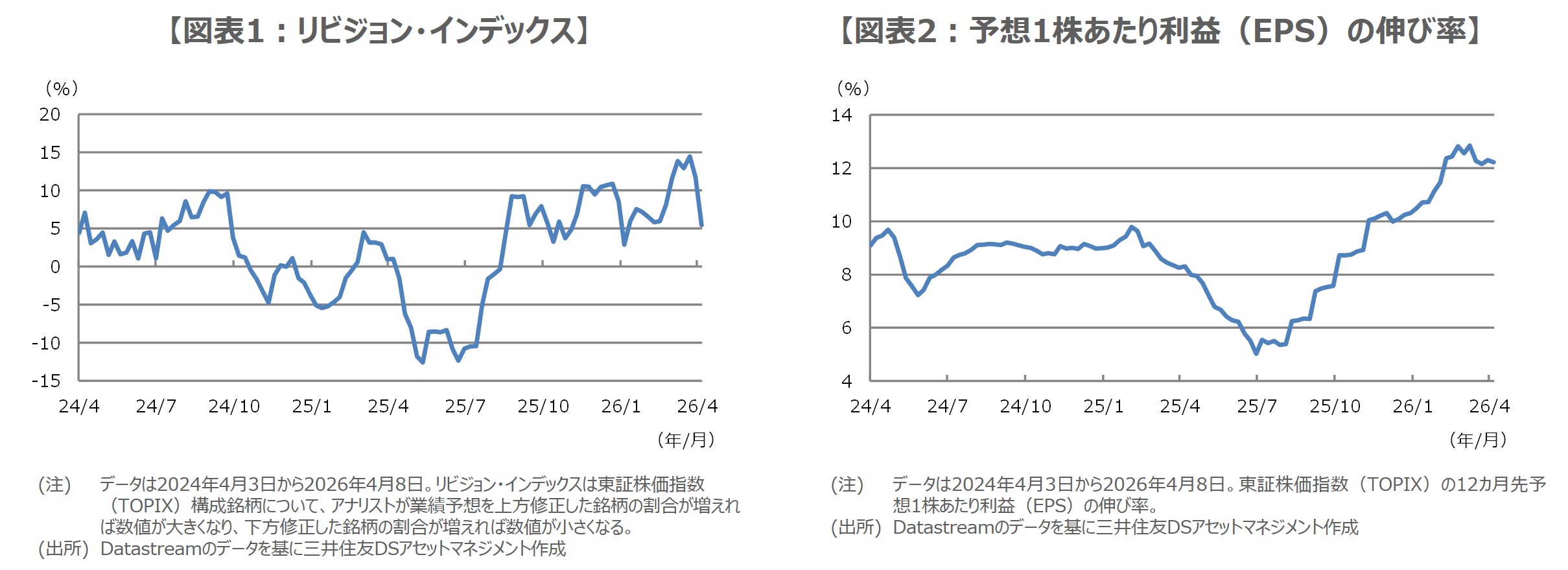 中東情勢の先行きは依然不透明感が残るため、企業の2026年度の業績見通しは、総じて控えめな内容となることも想定されます。その場合、市場の業績予想が下方修正され、前述のリビジョン・インデックスなどが低下し、株価の重しになる恐れもあります。ただ、年度初めの業績予想の目線が低ければ、その分、中東情勢が改善した際の、業績予想の上方修正を織り込む形での株価反発余地は大きくなるため、過度な悲観は必要ないと考えます。