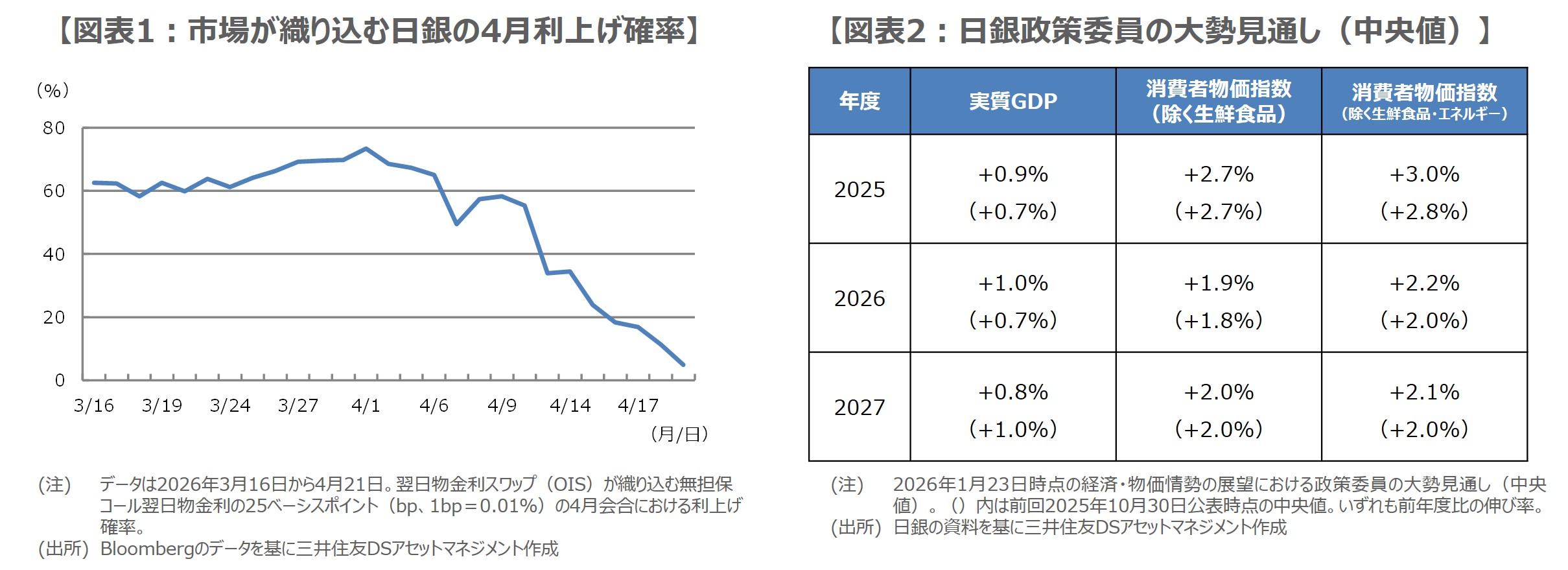 日銀は4月27日、28日に金融政策決定会合を開催します。市場が織り込む今会合での利上げ確率は、4月に入り一時7割に達していましたが、その後、日銀から利上げを示唆する情報発信もなく、利上げ観測は大きく後退しました(図表1)。また、直近で複数のメディアが4月の利上げは見送りとなる公算が大きいと報じており、無担保コール翌日物金利の誘導目標(現行0.75%程度)は3会合連続で据え置きとなることが予想されます。