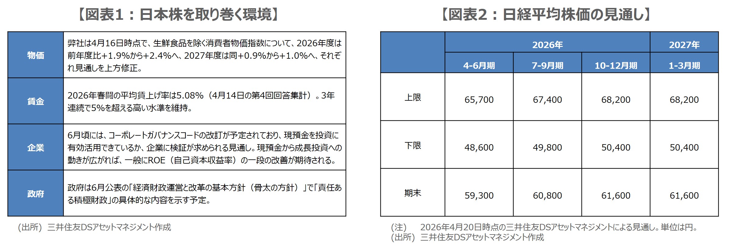 改めて、日本株を取り巻く環境に目を向けると(図表1)、総じて良好な状況は変わっておらず、物価はこの先、やや上振れが見込まれる一方、2026年春闘では平均賃上げ率が3年連続で5%を超える高い水準を維持しており、企業の現預金の活用でROE(自己資本収益率)の更なる改善も見込まれます。また、6月公表の「骨太の方針」で、成長投資や危機管理投資への期待が高まれば、株価上昇につながりやすいとみています。