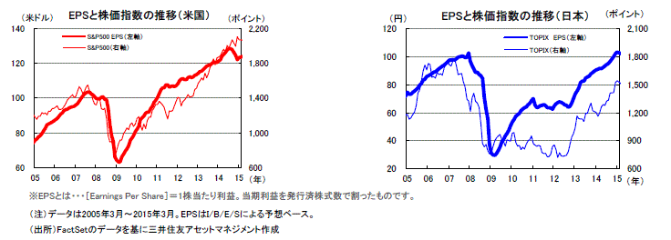 主要米国企業の2015年1-3月期の増益率は前年同期比▲2.8%(3月30日付けのトムソン・ロイターの集計に基づく)と、前四半期の同+7.0%から鈍化する見込みです。日本の主要企業(東証1部、3月期決算、除く金融)の2014年度予想は、経常利益が前年度比+7.8%程度の増益となる見込みです。