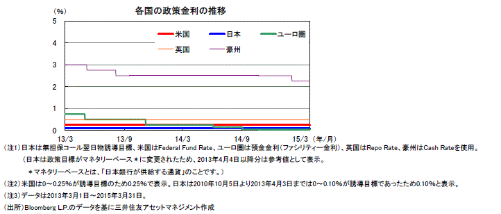 FRBは、低金利政策を当面継続する考えです。ECBは月600億ユーロペースで国債などを購入する量的金融緩和を開始しました。日銀は、マネタリーベースを年間約80兆円拡大させる強力な金融緩和を続けています。