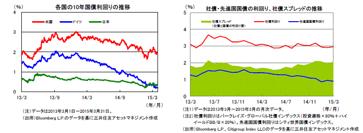 米国では、早期利上げ観測の後退や投資家のリスク回避の強まりなどから国債利回りは低下しました。欧州では、ECBによる国債購入の開始などから、国債の利回りは低下しました。日本では日銀の追加金融緩和期待の後退から、国債の利回りは上昇しました。米国の社債スプレッド(国債との利回り差)は、若干拡大しました。