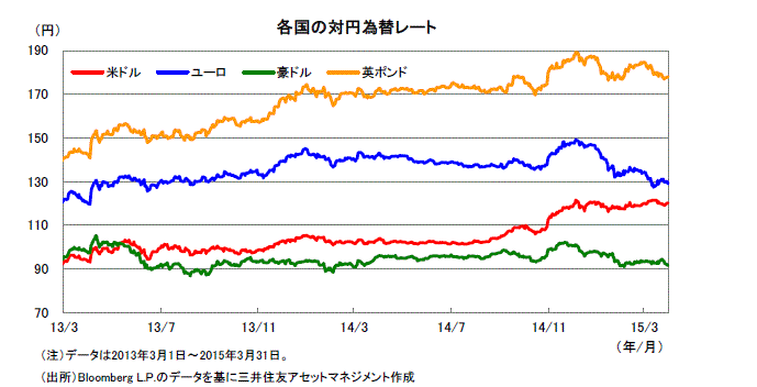 中国では、3月5日の全国人民代表大会(全人代、日本の国会に相当)開催から月末まで、約14%上昇しました。全人代では2015年の経済成長率目標は「7%前後」と引き下げられたものの、構造改革と安定成長の両立する新常態を目指す方針が正式に決定されました。投資や消費は減速するものの、積極的な財政政策や緩和的な金融政策が示され、政策期待から株式市場は大きく上昇しました。
