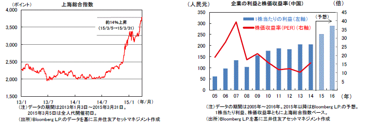 全人代以降、経済構造改革を進める政府方針が明確に示され、成長政策への期待も高まっています。これまでの労働集約的な製造業から、ITや先端技術を活用した付加価値の高い製造業への転換を狙う「メードインチャイナ2025」による企業の成長力を高める戦略や自由貿易区の創設、現代版シルクロード(一帯一路)の構築やアジアインフラ投資銀行(AIIB)創設をにらんだインフラ拡充策が今後打ち出されると見られます。株式市場は引き続きこれらを好感しそうです。ただし、上昇ペースが速かったことから短期的には高値警戒感が強まることも想定されます。