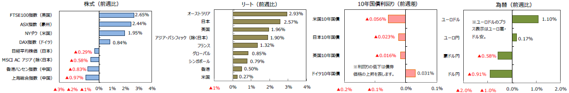米国の債券市場は、米連邦準備制度理事会(FRB)のパウエルFRB議長の発言を受けた緩和的金融政策の長期化観測が高まり、長期債利回りは週間で0.056%低下しました。日本、英国の10年国債利回りも低下しました。