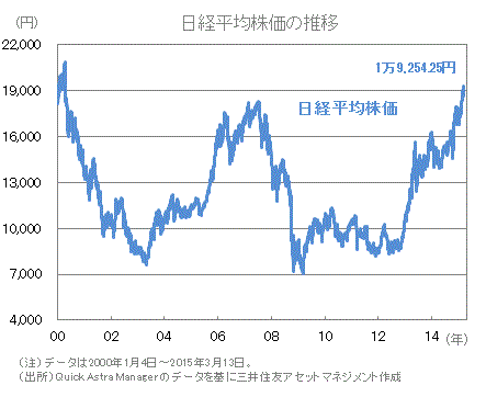 日本株は上昇しました。好調な企業業績、円安進行などから、日経平均の13日終値は、ほぼ15年ぶりに1万9千円台を回復しました。