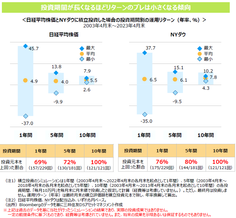 A.投資の基本は⻑期投資です。⼀般的に、投資期間が⻑いほど、リターンの上下のブレが⼩さくなると⾔われています。