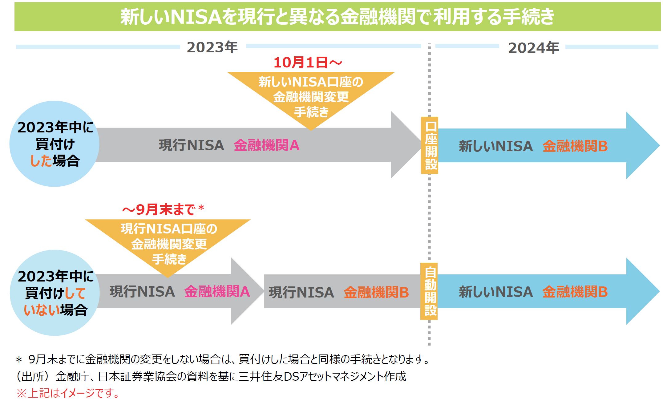 ■2023年中に買付けしていない場合は、2023年9⽉末までに現⾏NISA⼝座の⾦融機関の変更⼿続きを完了させることで、2024年1⽉に⾃動的に変更後の⾦融機関で新しいNISA⼝座が開設される予定です。また、9⽉末までに⼿続きを⾏わなかった場合には、買付けした場合と同様に、2024年に利⽤する新しいNISA⼝座の⾦機機関の変更として、10⽉以降に⼿続きできる予定です。