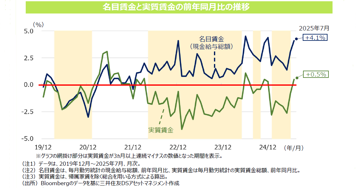 ◆「名目賃金」とは、給与などを通じて勤労者世帯が実際に受け取る賃金のことです。これに対して「実質賃金」は、名目賃金から物価変動の影響を除いて計算する賃金のことであり、勤労者世帯の購買力を反映しています。物価上昇よりも名目賃金の上昇率が低い場合は、実質賃金は減少し、勤労者世帯の購買力も低下します。近年、こうした傾向が続いていましたが、2025年の春闘で5%を超える賃上げが行われ、2025年7月の実質賃金の伸びは前年同月比で+0.5%と7ヵ月ぶりにプラスとなりました。米国の関税政策などが日本経済へ与える影響が懸念されている中、今後も名目賃金の上昇が物価上昇を上回り、実質賃金が継続的に増加するか注目されています。