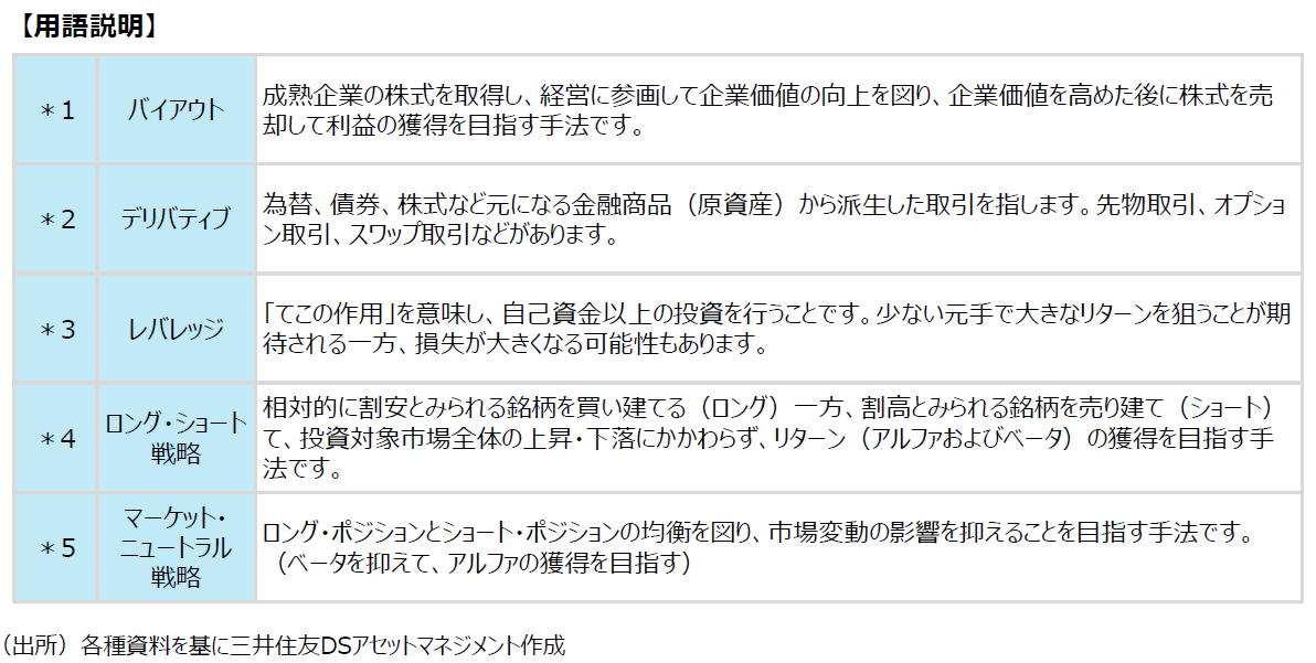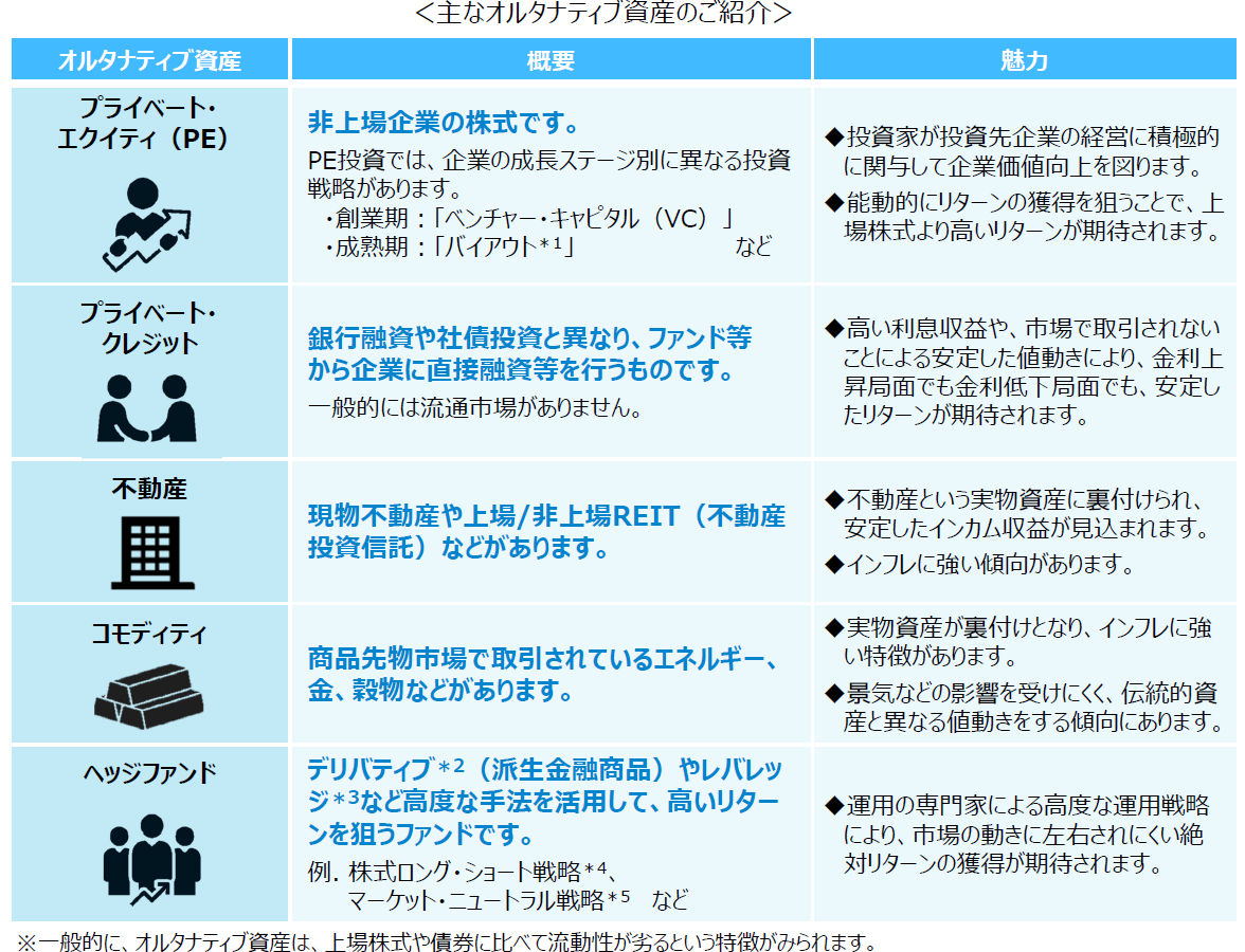 「オルタナティブ投資」とは、上場株式や債券などの伝統的資産と異なるリスク・リターン特性を有する、プライベート・エクイティ(⾮上場企業株)やコモディティ(商品)、ヘッジファンドなどへの投資を指します。