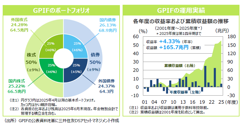 ◆⽇本の公的年⾦(厚⽣年⾦保険と国⺠年⾦)の運⽤はGPIF(年⾦積⽴⾦管理運⽤独⽴⾏政法⼈)が担っています。その運⽤資産額は約260兆円(2025年6⽉末現在)にのぼり、「世界最⼤級の年⾦基⾦」となっています。GPIFは、インフレやデフレをはじめとする様々な運⽤環境の下で、⻑期にわたり安全かつ効率的に年⾦積⽴⾦を運⽤するため、複数の資産を組み合わせて運⽤する「分散投資」を⾏っています。