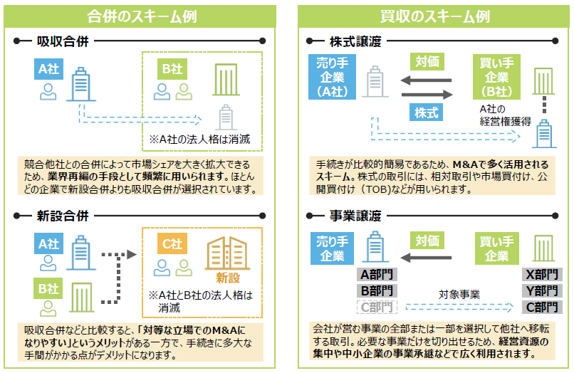 合併には「新設合併」と「吸収合併」、買収には「株式譲渡」や「事業譲渡」など、M&Aにはさまざまな手法(スキーム)があります。