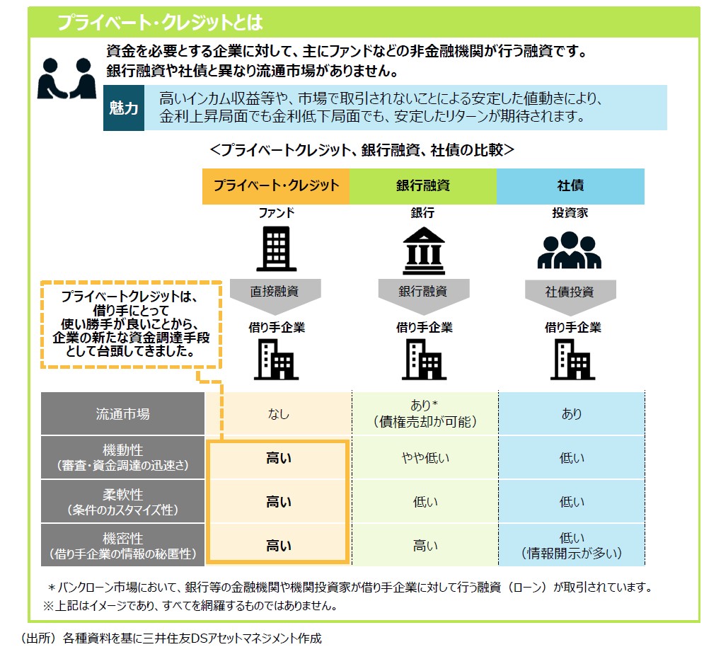近年、世界の⾦融機関がプライベート資産への投資を増やしています。また、個⼈投資家向けのプライベート資産を投資対象としたファンドも増加傾向にあります。プライベート資産は、上場株式や債券などの伝統的資産と異なるリスク・リターン特性を有する「オルタナティブ資産」の⼀つであり、その代表例として、プライベート・エクイティ(⾮上場株式)やプライベート・クレジット(ファンドなどによる融資)が挙げられます。
