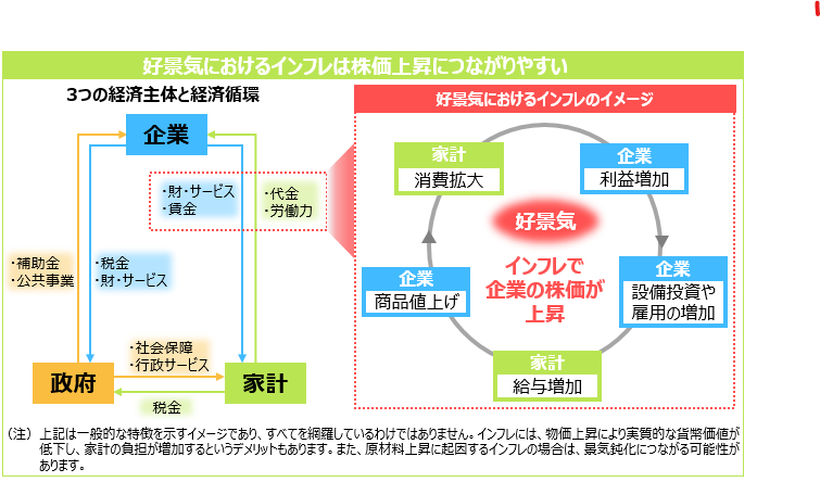 一般的に、企業の株価は企業業績に連動して動く傾向があります。世の中のモノ・サービスの価格が上昇するインフレ環境下では、企業業績が拡大し、株価の上昇につながりやすい傾向があります*。