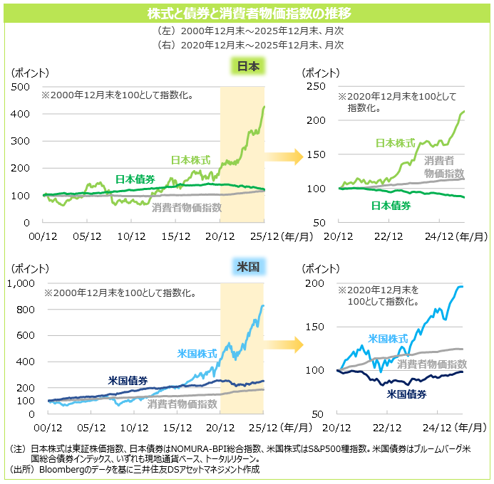 また、株価は企業が将来において得られる収益を反映し、成長期待が高まれば上昇しやすい傾向があります。インフレによって貨幣価値が目減りする局面においても、企業が提供するモノ・サービスの価格が上昇するため、相対的に資産の価値を維持・向上させやすいと考えられます。