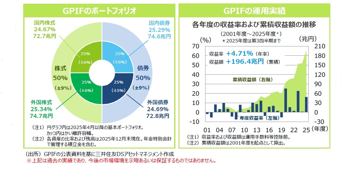 ◆日本の公的年金(厚生年金保険と国民年金)の運用はGPIF(年金積立金管理運用独立行政法人)が担っています。その運用資産額は約293兆円(2025年12月末現在)にのぼり、「世界最大級の年金基金」となっています。GPIFは、インフレやデフレをはじめとする様々な運用環境の下で、長期にわたり安全かつ効率的に年金積立金を運用するため、複数の資産を組み合わせて運用する「分散投資」を行っています。