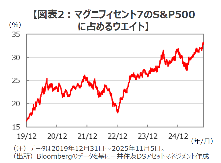 ■というのも、高成長ゆえに米大手ハイテク株には高いPERが付される傾向にありますが、そうした高PERの大手ハイテク株の時価総額が増加することで、S&P500の時価総額に占めるウエイトが大きく上昇しているからです。例えば、マグニフィセント7(アルファベット、アマゾン・ドット・コム、メタ・プラットフォームズ、アップル、マイクロソフト、テスラ、エヌビディアの7社)のS&P500に占めるウエイトは、この6年余りの間に概ね倍の水準に増加しています(図表2)。