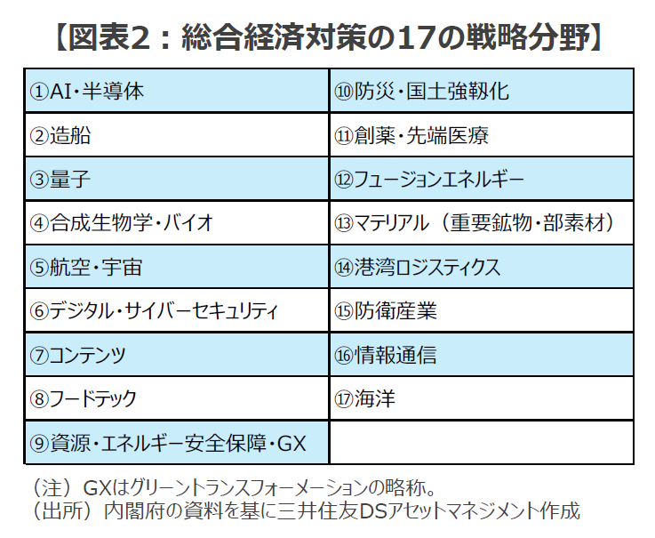 ■さらに、高市政権は11月10日に開いた「日本成長戦略会議」で、AI、半導体、造船、防衛、核融合などの17の戦略分野への投資促進策を打ち出しました(図表2)。ちなみに、高市総理はかつて自身の著書で企業がため込む現預金への課税を主張したり、2024年の自民党総裁選では膨大な内部留保の活用を促すコーポレートガバナンス・コードの改定を主張するなど、企業の抱える巨額の現預金について「並々ならぬ」問題意識を見せてきました。