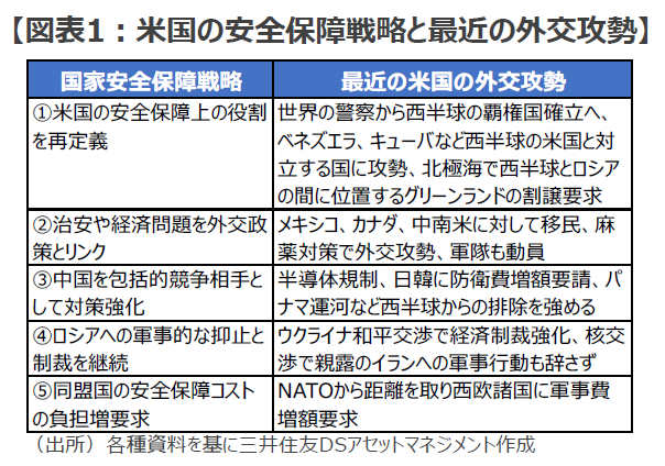 ■米国は昨年12月に国家安全保障戦略(NSS 2025)を改定しましたが、そのポイントは、①国益を最優先して米国の安全保障上の役割を再定義し、②国内治安や経済問題を安全保障の課題として外交政策とリンクさせ、③中国を「最も包括的な競争相手」として経済・軍事・技術の全領域での競争を強化し、④ロシアへの軍事的な抑止と制裁を継続するとともに、⑤各地域の安全保障について同盟国の負担増と米国の負担軽減を求める、といった内容でした。