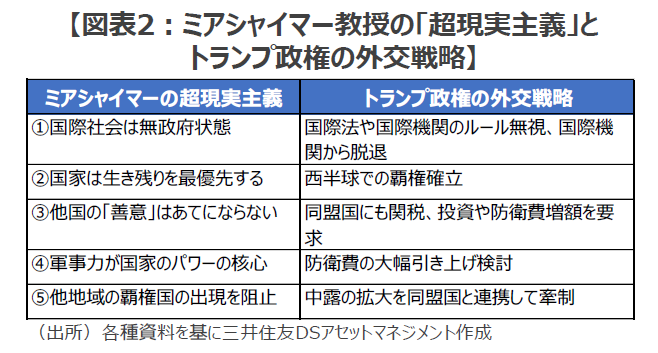 ■大国がなりふり構わず国益を追求し、国際的な秩序・ルールが形骸化する中、世界の金融市場は今後どのように変化し、それに対応して私たちの投資戦略はどう変化していかなくてはならないのでしょうか。米国が「超現実主義」的な外交・安全保障政策を今後も強力に推し進めていくと仮定した場合の、中長期(3~5年)の投資シナリオ・トレンドを想定しながら、国際政治のリアリズムから目をそらすことなく整理していきたいと思います。