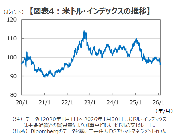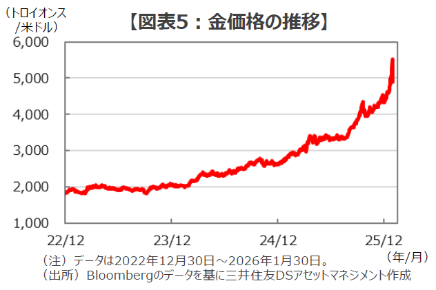 ■世界最大の政府系ファンドであるノルウェー政府年金基金の専門家委員会は、1月26日に地政学リスクへの対応力を高める必要があると報告書で指摘しましたが、こうした新たな環境に対応しようとする動きはすでに金融市場で顕著になっています。特に、米国発の地政学リスクの顕在化を恐れた資金が金を始めとする貴金属・実物資産に逃避する動きが強まり、金のスポット価格は足元で1トロイオンス当たり5,000ドルの大台を突破して急伸しています。