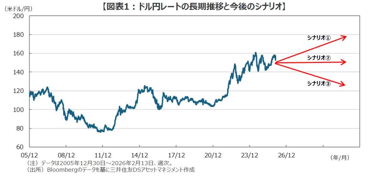 ■今後の中長期的なドル円の展開を網羅的に考えると、大きく3つのシナリオが想定されます。それは、①140~160円のレンジ上限を突破、20円上方に切り上がった新しいレンジ上限となる180円を目指す展開、②現在の140~160円のレンジ取引の継続、そして、③過去3年の円安トレンドの全戻しとなる、120円台半ばを目指す展開、の3つです(図表1)。