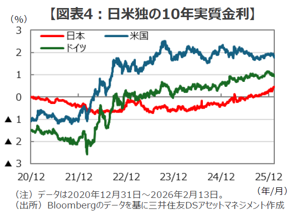 ■このうち、①については、結論から言えばその可能性は極めて限定的と見ていて良さそうです。というのも、ベッセント米財務長官の発言に呼応する形で2025年12月に日銀が利上げに踏み切ったことで、日米の協調による政策対応が今後も期待されるからです。ベッセント長官は2025年10月に、日本でのコストプッシュインフレへの対応について、「市場と対話しつつ、健全な金融政策を」と釘を刺し、日本に対して為替介入の前に利上げを実施するよう促していました。