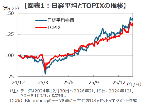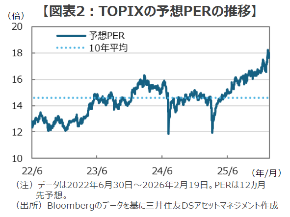■2025年の日本株の動向を振り返っても、日経平均株価は年間に約26.2%上昇、TOPIXは約22.4%、そして、電線株を含む非鉄金属株は100%を超える高パフォーマンスを記録しました。その一方で、①昨年4月にはトランプ関税ショックにより市場は大幅な調整に見舞われ(図表1)、②予想株価収益率(PER)は過去平均から上振れした「割高状態」が続き(図表2)、そして、③世界の株高をけん引してきた米国のAI関連株についてはデータセンターへの過剰投資が問題視されるようになるなど、「売る理由」に事欠かない年であったのも事実で、手練れのプロ達でも頭を悩ませる難しい相場展開でした。